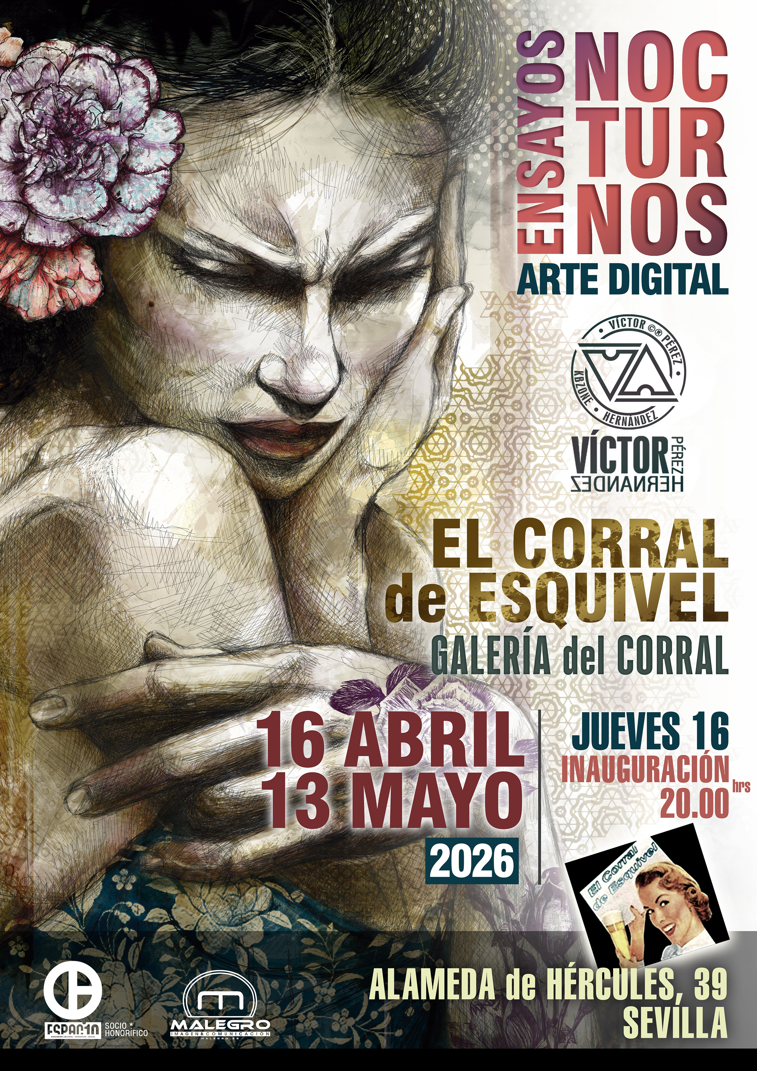 Estimados señoras/es, Nos complace invitarle a la inauguración de la Exposición "Ensayos Nocturnos" una muestra que reúne una selección de obras donde la ilustración, la experimentación técnica y la búsqueda de significado dialogan entre lo tradicional y lo digital. Será un placer contar con su presencia en este encuentro dedicado al arte, la creatividad y el intercambio cultural. Fechas de exposición Del 16 de abril al 13 de mayo de 2026 Inauguración 16 de abril a partir de las 20:00 h * Durante la inauguración se ofrecerá una consumición de cortesía y postales de regalo hasta fin de existencias. Horario de visita De 12:00 h a 01:00 h De lunes a domingo Semana de Feria Cerrado Espero poder saludaros personalmente y compartir con ustedes esta nueva muestra expositiva que engloba el trabajo de unos 5 años. Atentamente, Víctor Pérez Hernández